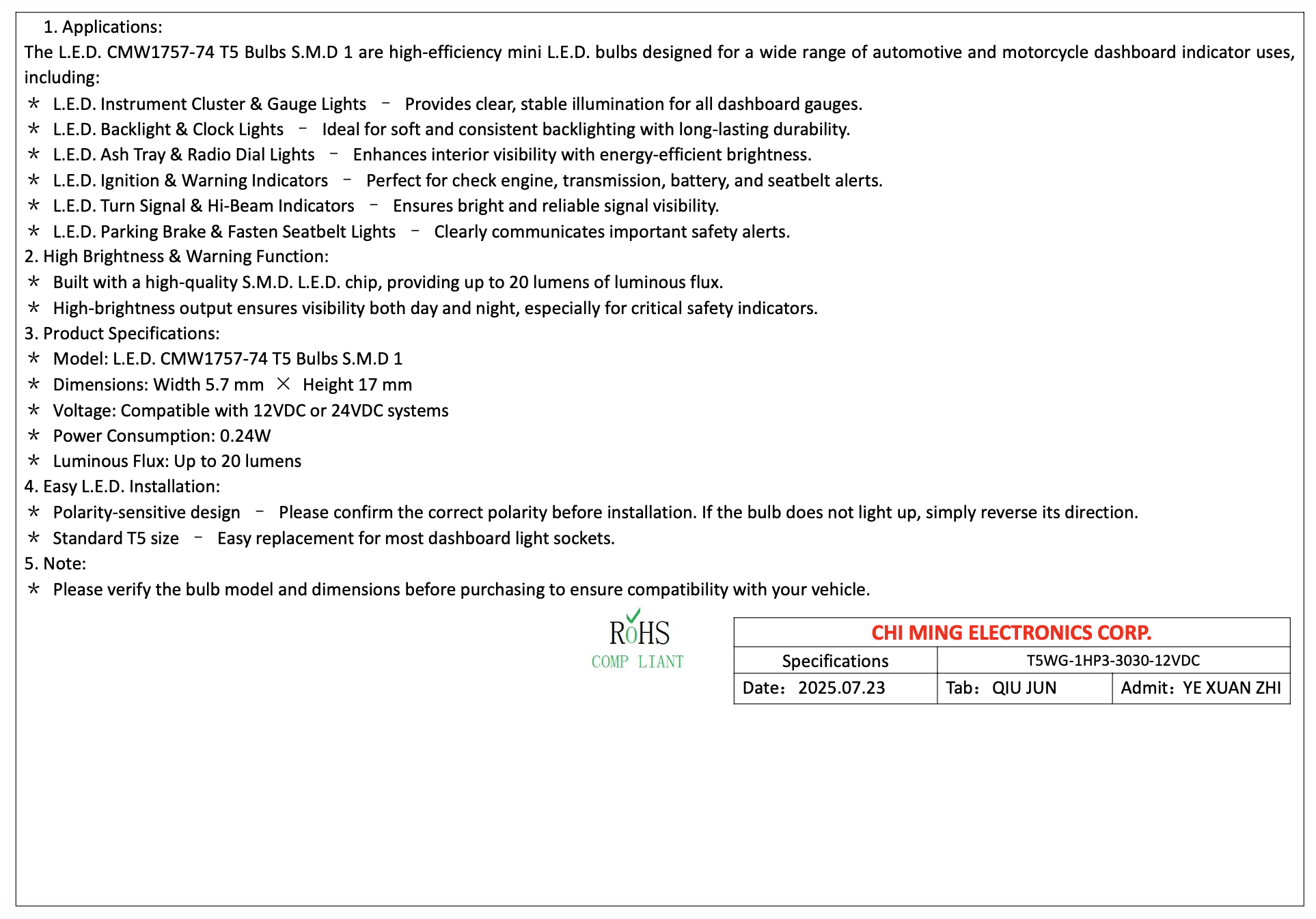 The L.E.D. CMW1757-74 T5 Bulbs S.M.D 1 are high-efficiency mini L.E.D. bulbs designed for a wide range of automotive and motorcycle dashboard indicator uses, including: