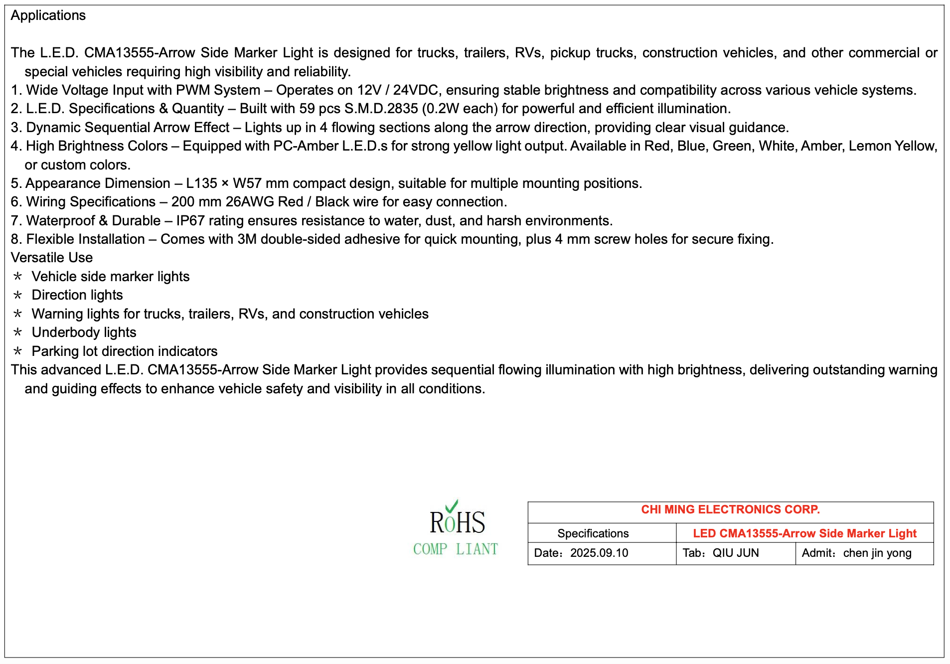 This advanced L.E.D. CMA13555-Arrow Side Marker Light provides sequential flowing illumination with high brightness, delivering outstanding warning and guiding effects to enhance vehicle safety and visibility in all conditions.
