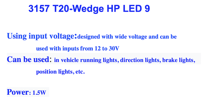 • Car LED(Truck LED) ,Vehicle rear lights. position lights .Reading Light. Side Light.