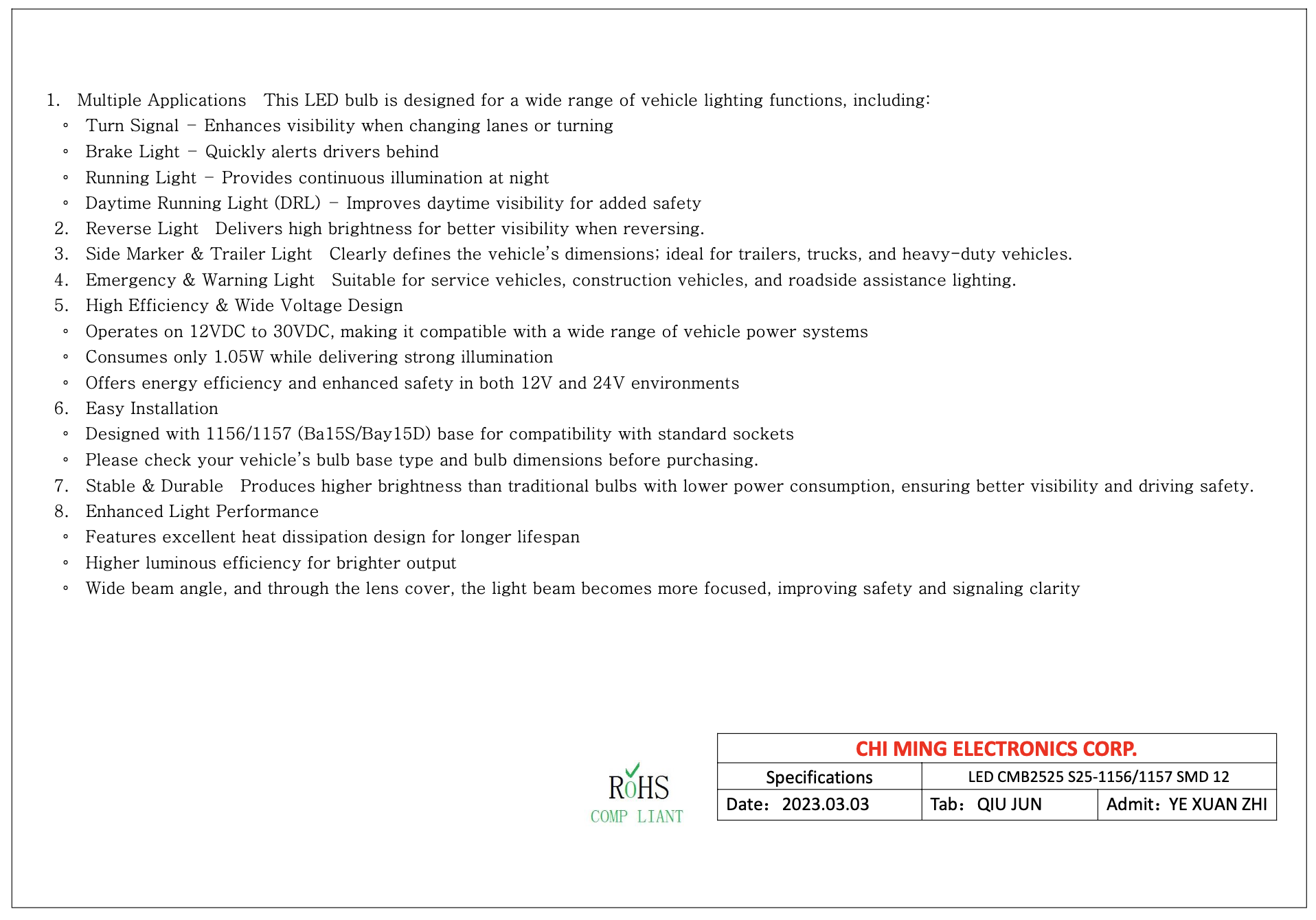 This LED bulb is designed for a wide range of vehicle lighting functions, including:- * Turn Signal – Enhances visibility when changing lanes or turning