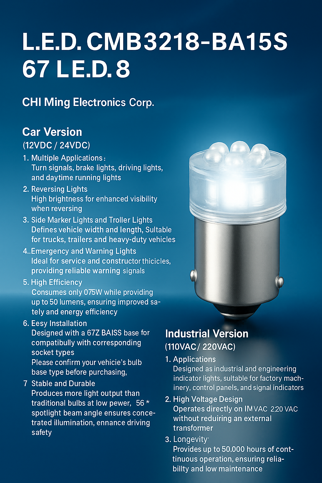 Designed with a 67 Ba15S base, the L.E.D. CMB3218-BA15S ensures quick installation and compatibility with corresponding automotive lamp sockets.