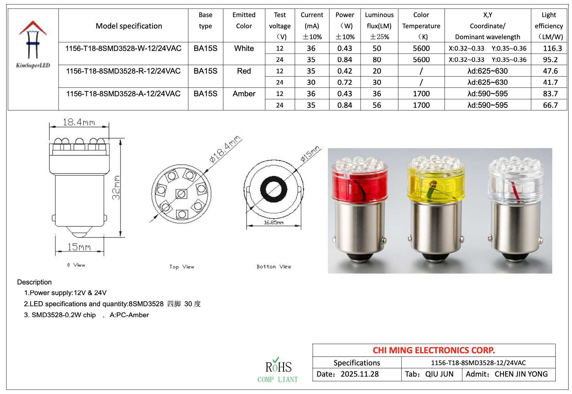 The L.E.D. CMB3218-BA15S provides more light output compared to traditional bulbs at significantly lower power consumption.