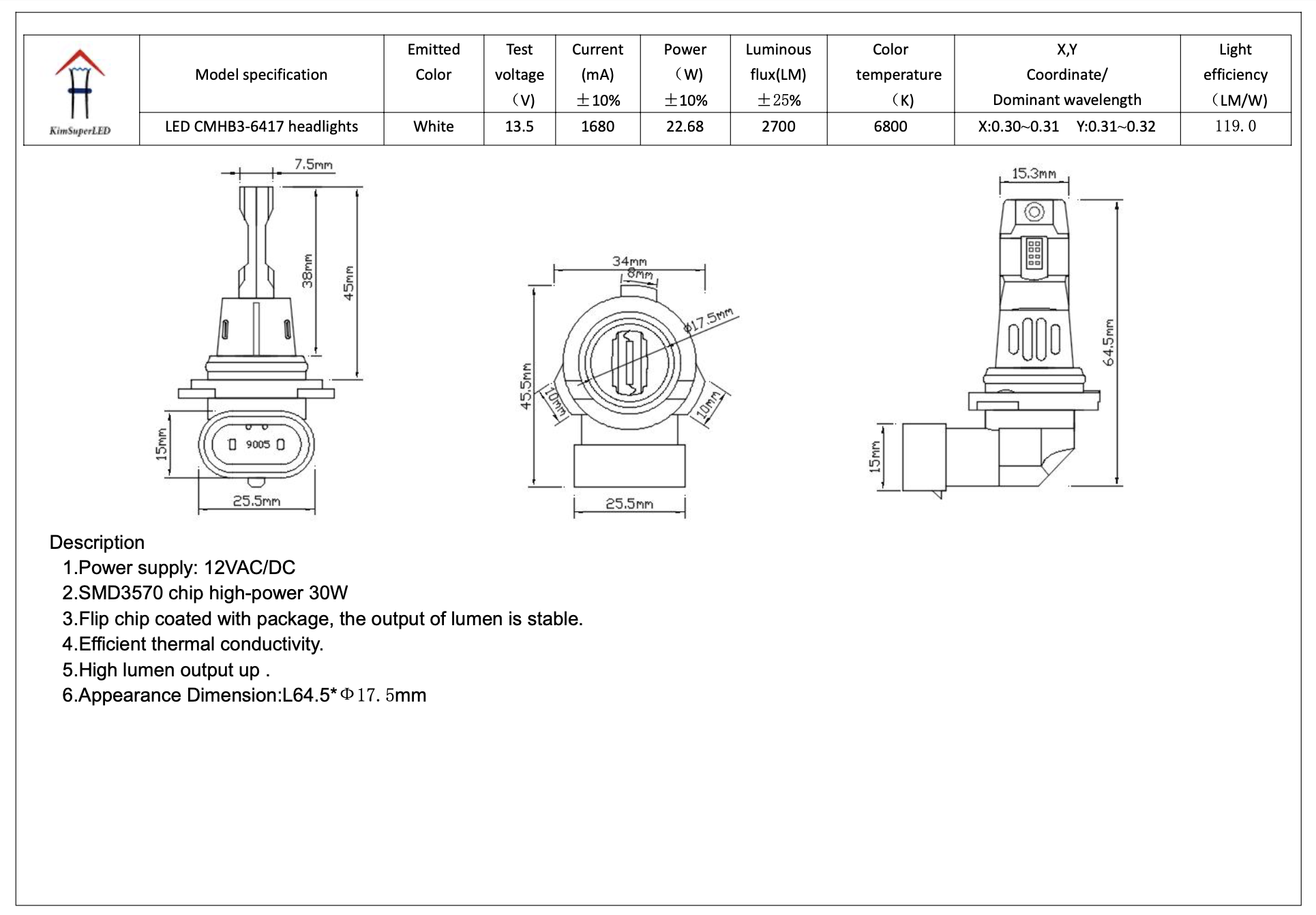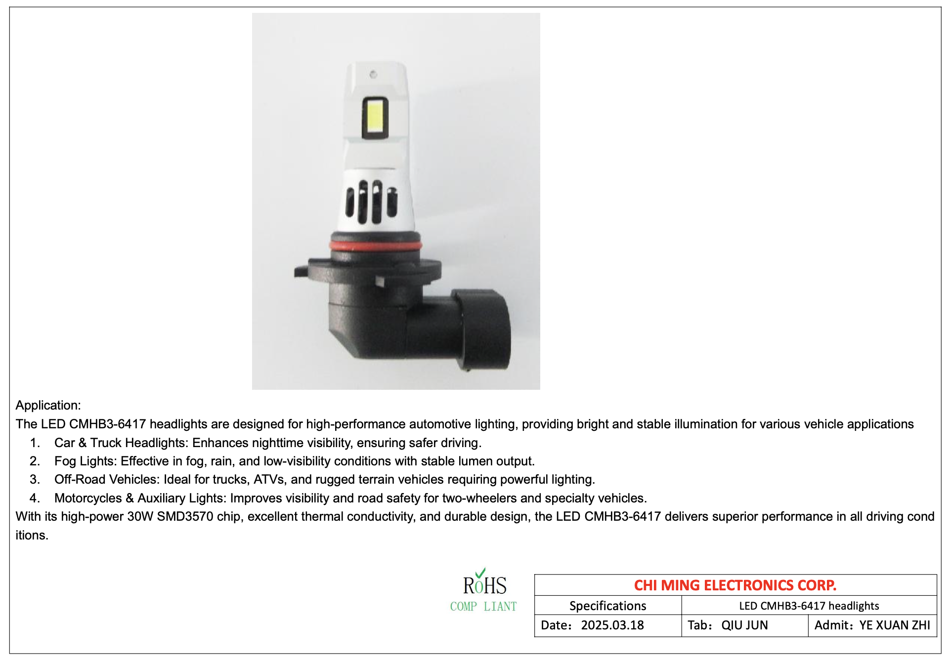 The LED CM6417-HB3 Headlights are designed for high-performance automotive lighting, providing bright and stable illumination for various vehicle applications: