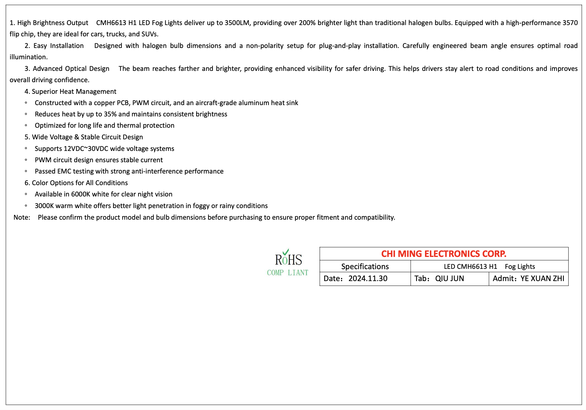 CMH6613 H1 LED Fog Lights deliver up to 3500LM, providing over 200% brighter light than traditional halogen bulbs. Equipped with a high-performance 3570 flip chip, they are ideal for cars, trucks, and SUVs. - Easy Installation