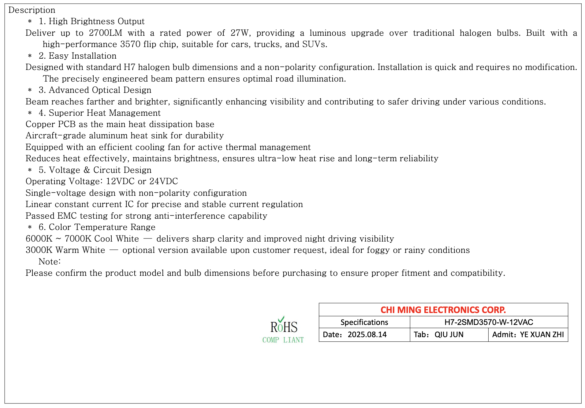 Designed with standard H7 halogen bulb dimensions and a non-polarity configuration. Installation is quick and requires no modification. The precisely engineered beam pattern ensures optimal road illumination.