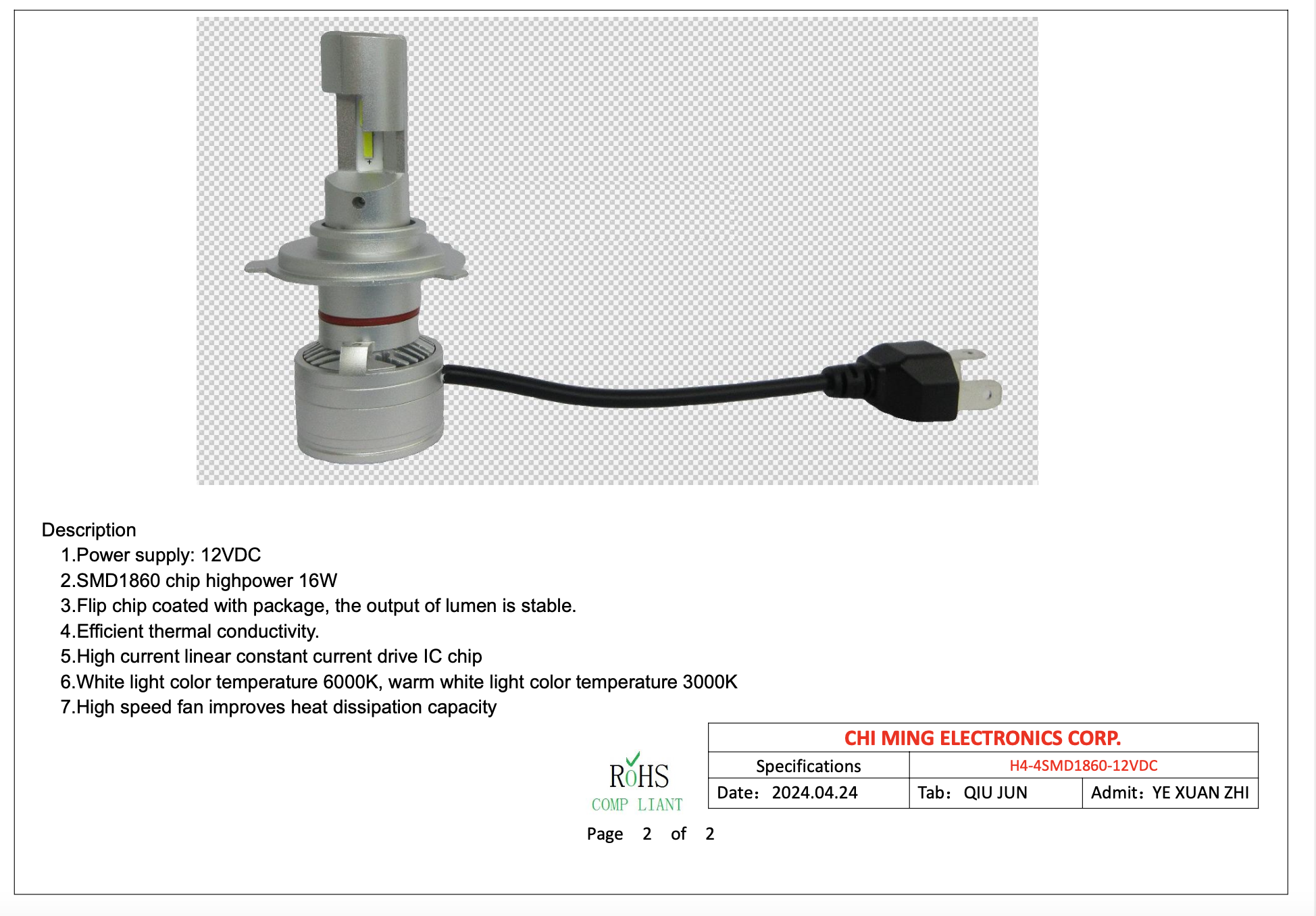 The LED CMHD6018 headlight bulb's beam can be projected evenly on the road without black spots or shadow areas. An LED CMHD6018 headlamp includes both low-beam and high-beam functions.