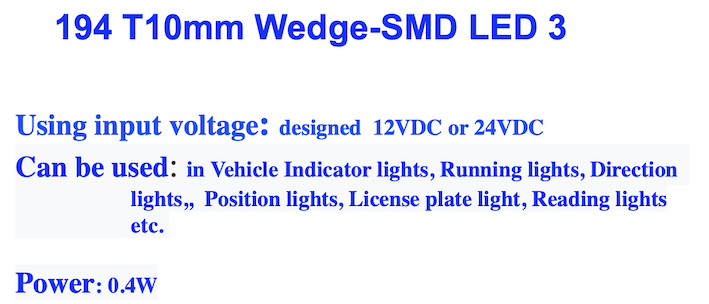• 194 T10mm Wedge-SMD LED 3/