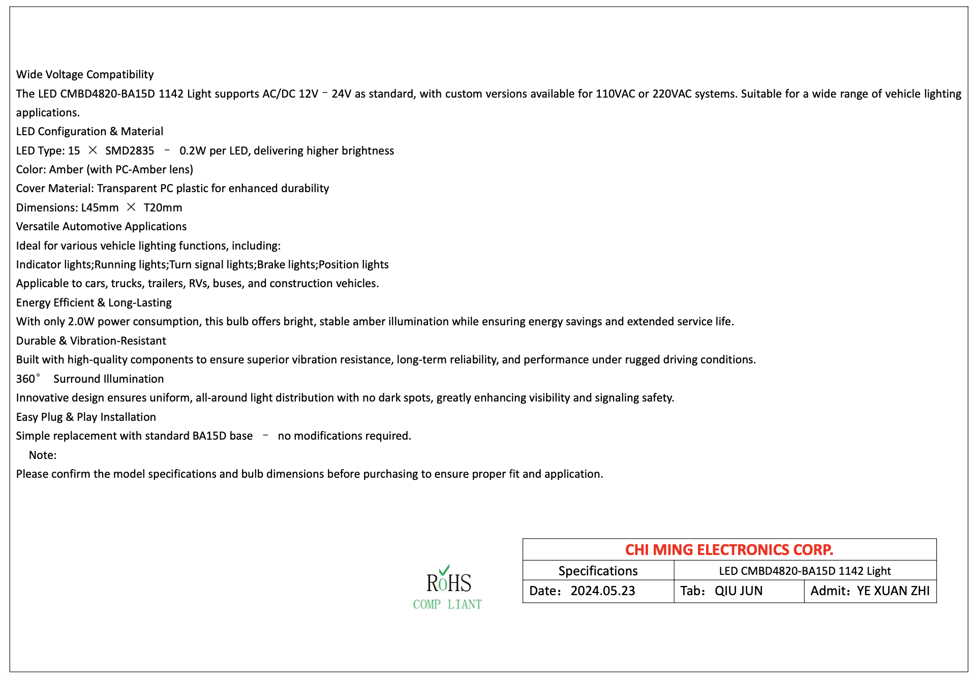 The LED CMBD4820-BA15D 1142 Light supports AC/DC 12V–24V as standard, with custom versions available for 110VAC or 220VAC systems. Suitable for a wide range of vehicle lighting applications. - LED Configuration & Material
