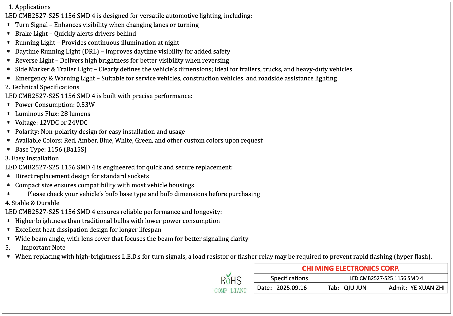 L.E.D. CMB2527-S25 1156 S.M.D 4 ensures reliable performance and longevity: