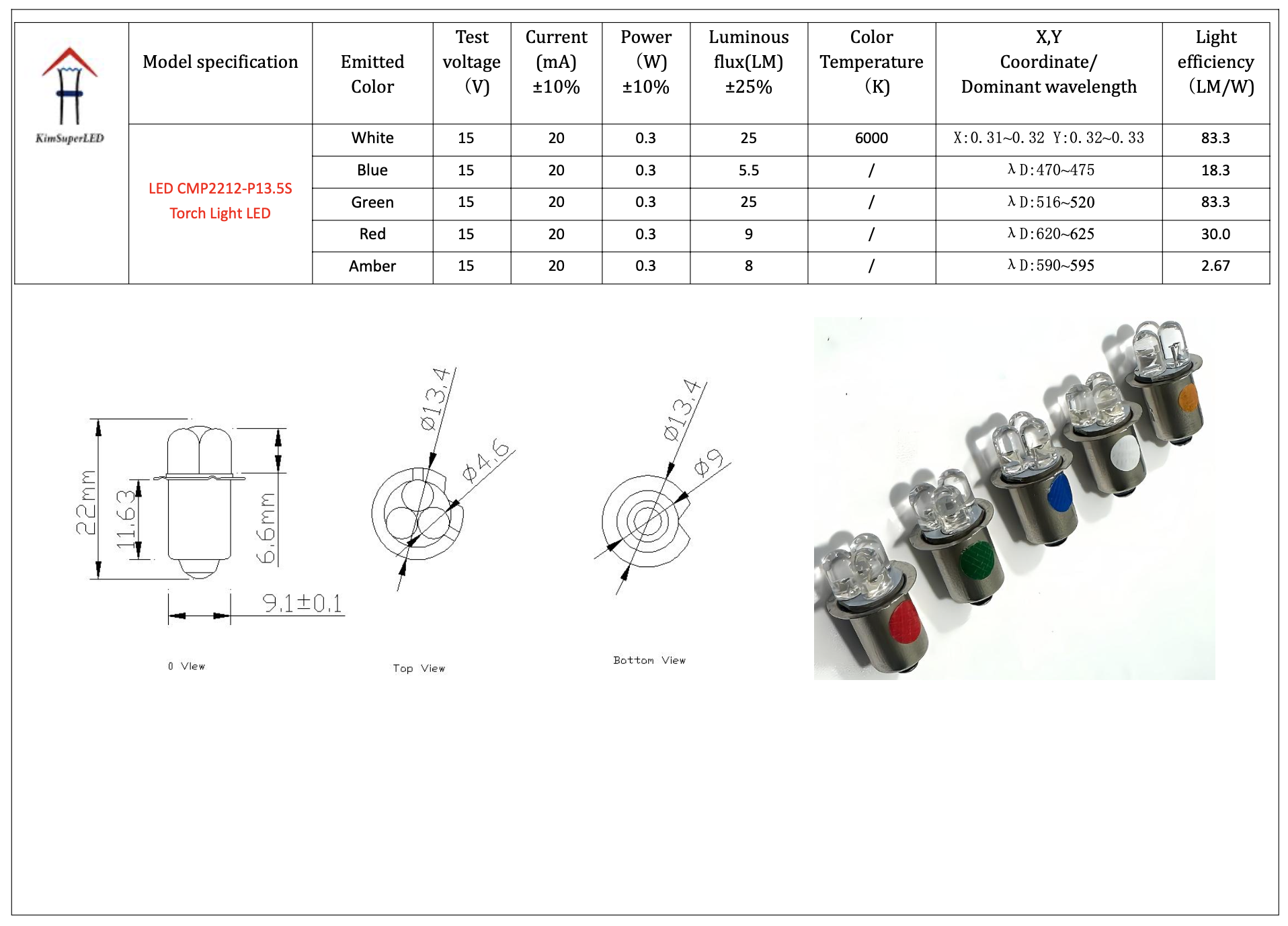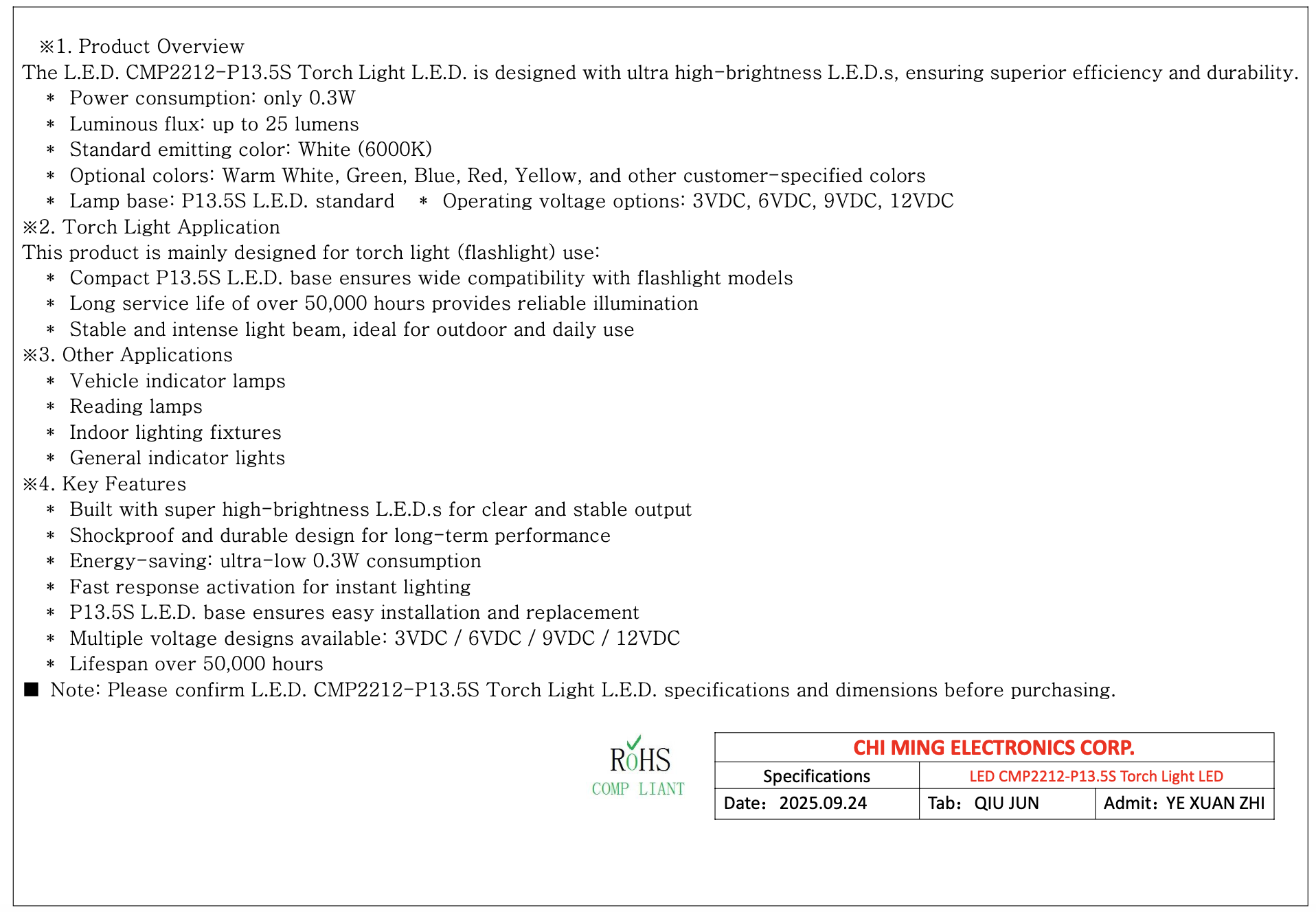 👉 Note: Please confirm L.E.D. CMP2212-P13.5S Torch Light L.E.D. specifications and dimensions before purchasing.