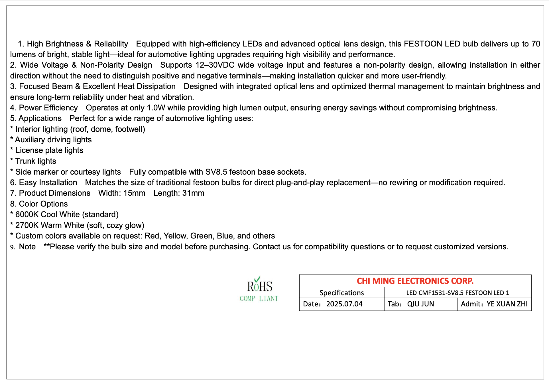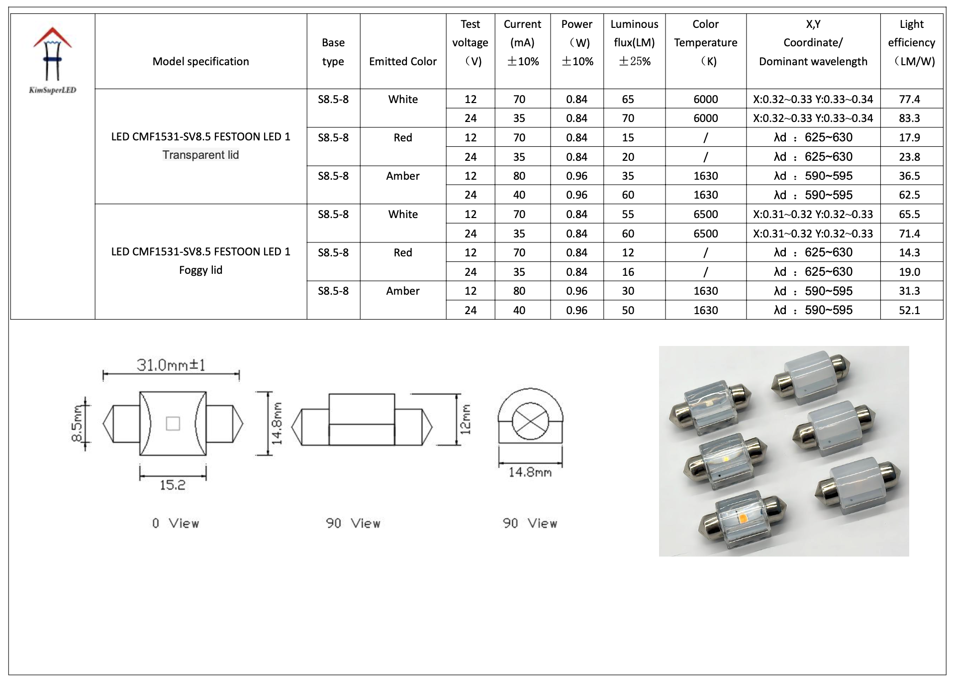 Equipped with high-efficiency LEDs and advanced optical lens design, this FESTOON LED bulb delivers up to 70 lumens of bright, stable light—ideal for automotive lighting upgrades requiring high visibility and performance.