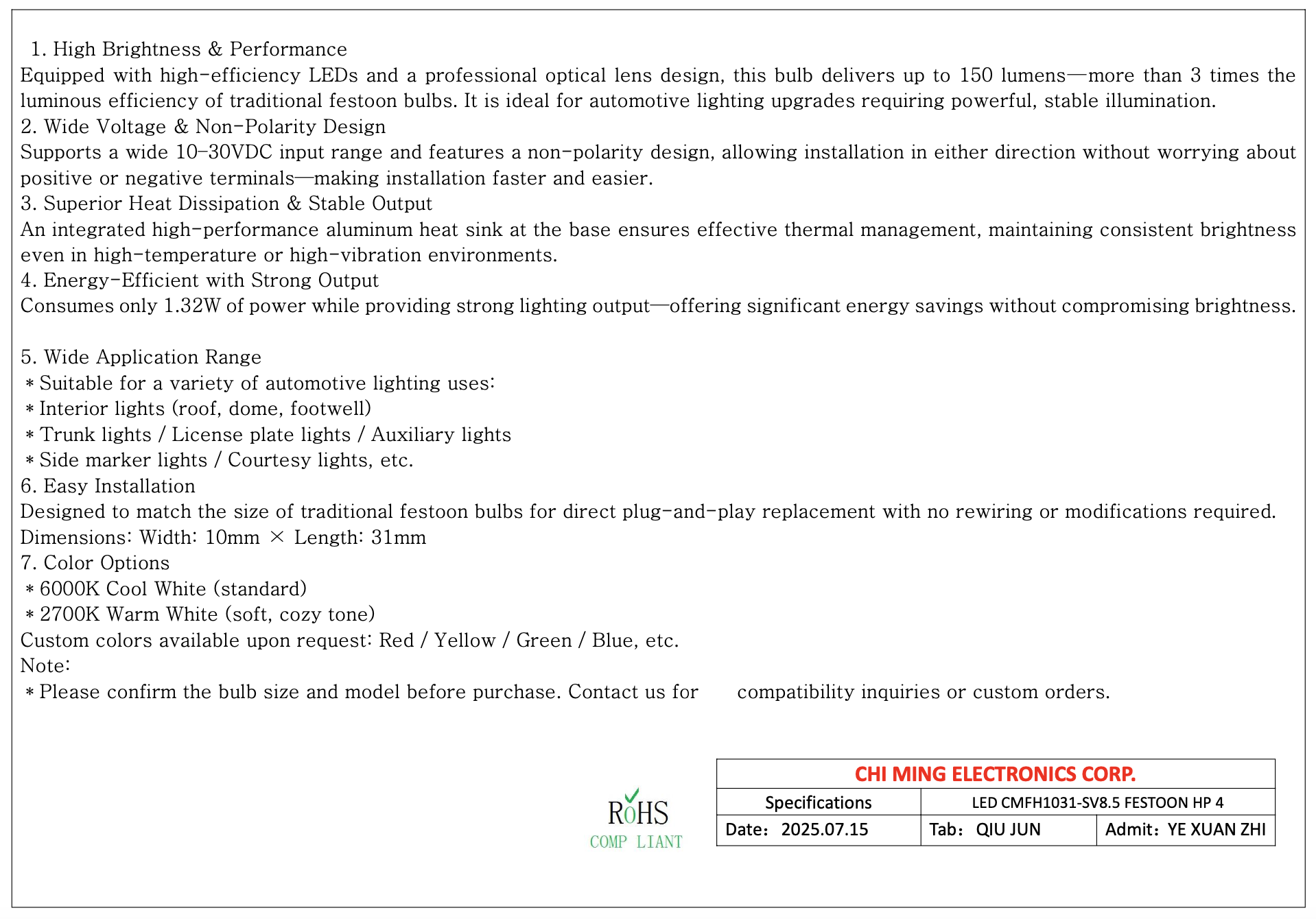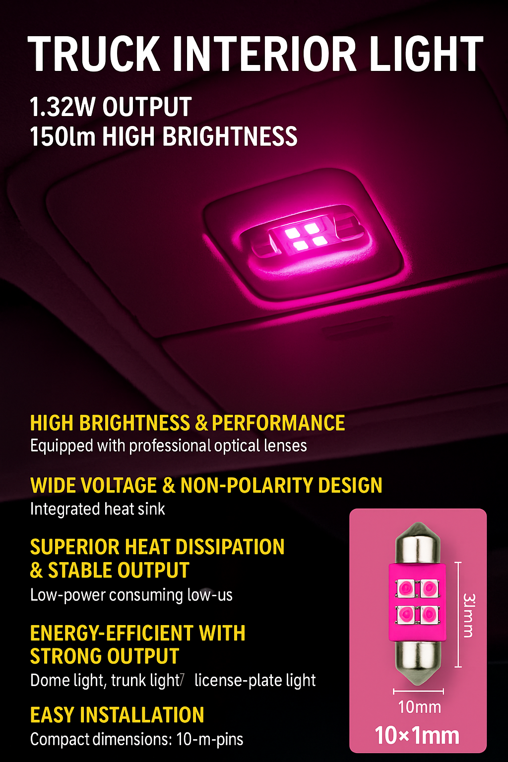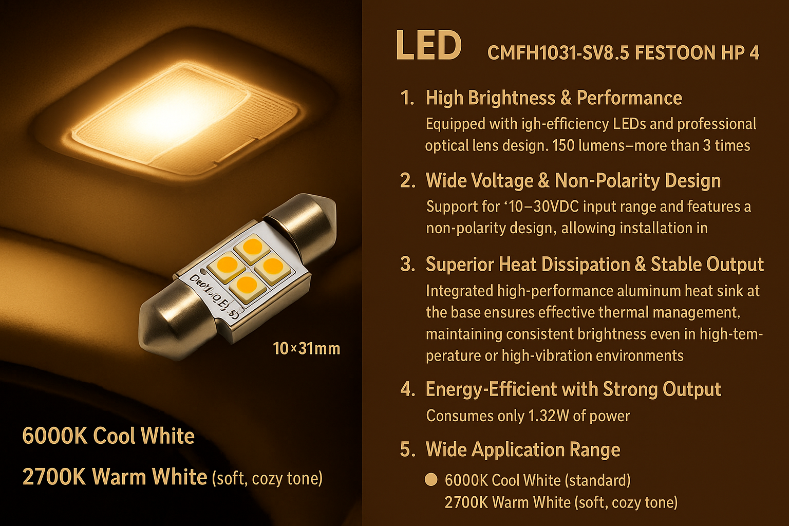 Equipped with high-efficiency LEDs and a professional optical lens design, this bulb delivers up to 150 lumens—more than 3 times the luminous efficiency of traditional festoon bulbs. It is ideal for automotive lighting upgrades requiring powerful, stable illumination.