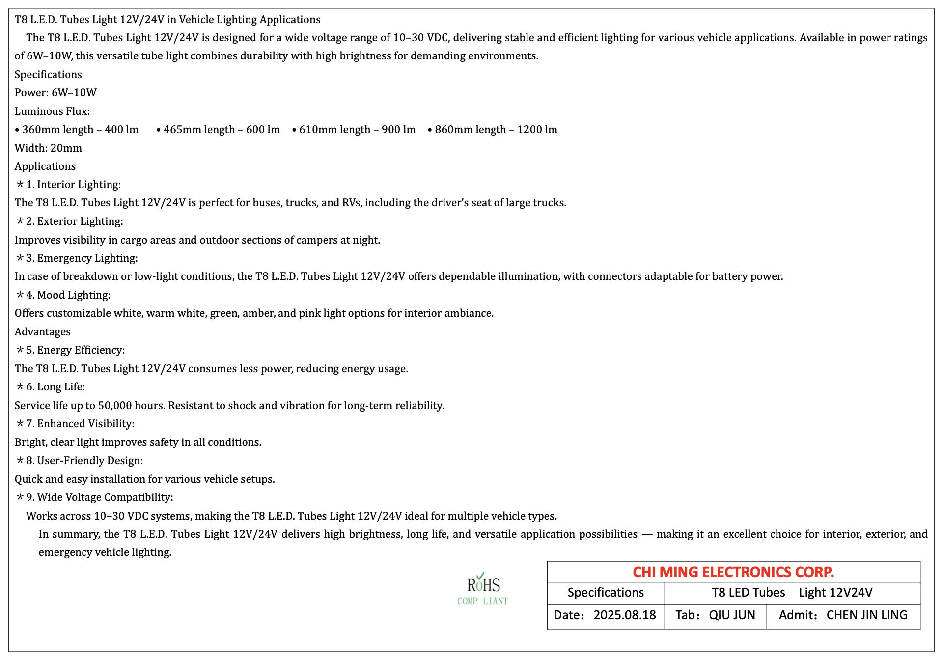 The T8 L.E.D. Tubes Light 12V/24V is perfect for buses, trucks, and RVs, including the driver’s seat of large trucks.