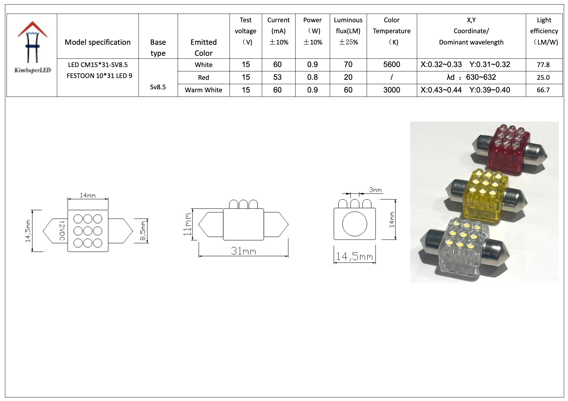 Supports 12V or 24V, with the voltage value clearly marked on each L.E.D. CM1531-SV8.5 FESTOON 10*31 L.E.D. 9 bulb for proper usage. - Special Features